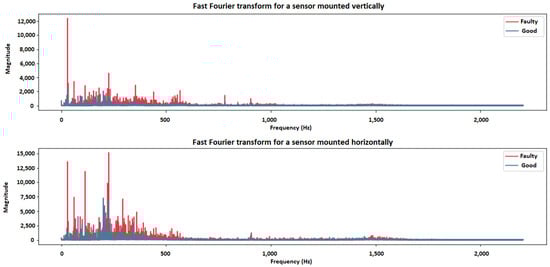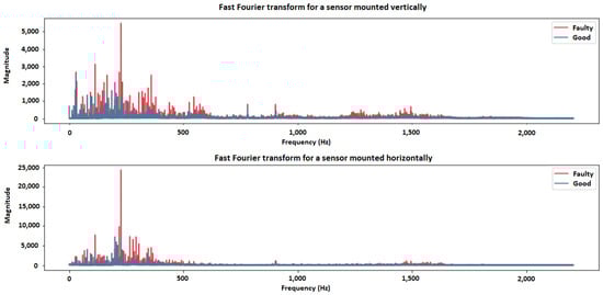 Analysis of the obtained results was carried out after collecting the data from the acceleration sensors. For this purpose, a fast Fourier transform was carried out for both the signal from the system without damage and the system in which the damage occurred in the pulley, drive belt, or both at the same time. First, the analysis was performed for the failed pulley (Figure 3).