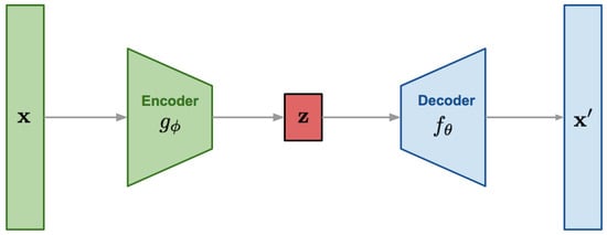 AutoEncoder is a generative unsupervised deep learning algorithm used for reconstructing high-dimensional input data using a neural network with a narrow bottleneck layer in the middle which contains the latent representation of the input data [20,21] (Figure 6). Autoencoder neural network is an unsupervised machine learning algorithm that applies back propagation by setting target values equal to inputs. An autoencoder consists of three components: an encoder, a coder, and a decoder. The encoder’s job is to compress the input data, then the encoder’s job is to generate the code so that the final decoder reconstructs the input data as accurately as possible using only that code. Given a data point , the loss function is viewed as minimizing the reconstruction error between the training data (x) and the autoencoder outputs [22]: