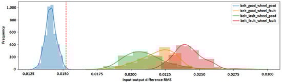 In this study, the performance of the algorithm was verified on data separate from the training set, i.e., data that the algorithm did not process in the learning process. Test data samples were provided for the efficient belt transmission, as well as for the individual failures investigated in this experiment. First, data from a sensor placed horizontally with respect to the belt transmission were input to the proposed algorithm and the learning process of the algorithm was performed to match the data from the undamaged transmission.