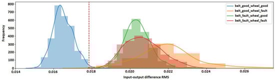 Based on the results obtained, the density distribution of the mapping error of the undamaged values was determined (Figure 7). The largest error value obtained was 1.51%. In the next step, data from the damaged devices were input to the learned autoencoder. The minimum value of the mapping error was determined, which was 1.75%, and the distribution of the mapping error density for the damaged values (Figure 7). Determination of the maximum error of the correct values allowed us to draw a cutoff curve of the undamaged class from the damaged class (red line Figure 7). The mapping error value above which the autoencoder algorithm considered the input signal as anomalous was 1.48%. Finally, the F1 value for the classification test was determined to be 98.89%.