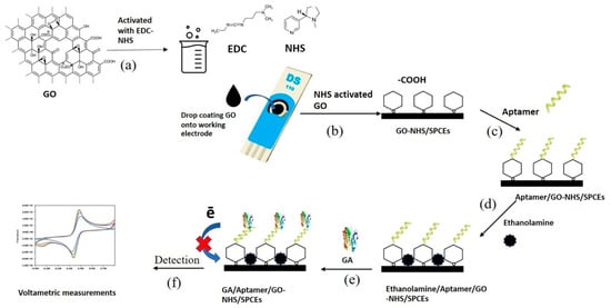 Among the biosensors for the detection of biomolecules, such as proteins, electrochemical-based aptamer biosensors have emerged as an ultrasensitive, rapid, and cost-effective approach [,]. Electrochemical biosensors transduce the biomolecular reaction into the electrochemical signal via the transducer and quantify the number of antigens in the sample. Label-free detection is proven to be simple, time saving and more applicable than label-based protocols. Different electrochemical biosensors depend on the types of applied signals and responses []. Graphene oxide (GO), an oxidized form of graphene, can exhibit a higher affinity in attaching biomolecules through amidic bonds. GO has been implied as a transducer in biosensing elements because of its broad surface area, electrical conductivity, high charge transfer, and capability to immobilize different biomolecules []. Graphene-based nanomaterials have been widely used in electrochemical sensors because they facilitate electron transfer reactions, thereby generating high signal sensitivity. Bunyarataphan et al. reported an electrochemical aptasensor with a low LOD (3 ng mL−1) []. The fabrication is based on the streptavidin (STR)-biotin aptamer reaction, which is simple yet has a prolonged processing time requiring overnight incubation of STR to firmly bind onto the electrode surface. Another study also reported a reduced-GO/gold nanoparticle aptamer-based electrochemical detection system for GA measurement with a LOD of 0.07 µg mL−1 []. However, it presents some drawbacks, such as the cost of fabrication and the application of glass carbon electrodes, which require cleaning and mechanical polishing prior to testing.