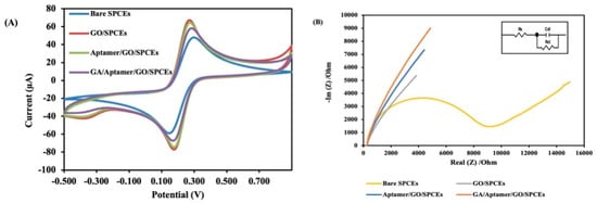 (A) Cyclic voltammograms of Bare SPCEs, GO–SPCEs showing successful immobilization of each layer. (B) EIS spectra of Bare SPCEs, GO-SPCEs, aptamer/GO–SPCEs, and GA/aptamer/GO–SPCEs in 5 mM [Fe (CN)6]4–/3–. The inserted circuit graph in (B) is the EIS fitting model.