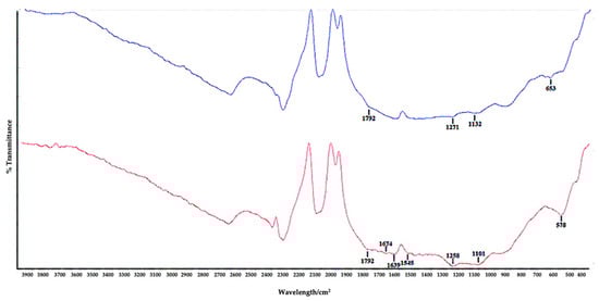 FTIR characterization was carried out for the characterization of the functionalized GO. Figure 3 illustrates the FTIR spectra of the original GO and EDC/NHS-activated GO. The bands at 1271 and 1258 cm−1 represent the C–O stretching (ether) of the original GO and activated GO, respectively. The peaks at 1132 and 1101 cm−1 were attributed to C–O stretching (alcohol) of the original and activated GO. C–H bending (aromatic) functional groups were observed in the 1792 and 1674 cm−1 peak positions. The broad band at 2669 cm−1 was attributed to O–H stretching of both GO types. The absorption peaks were more intense for activated GO than for the original GO. These factors contribute to the characteristics of GO, as reported by previous studies [,,,]. New bands were introduced at 1639, 1545 and 578 cm−1, corresponding to N–H stretching and C–N stretching of activated GO. This proves that the chemical modification resulted in amine groups that reacted with NHS. FTIR spectra revealed that GO functionalization of the amine-modified aptamer was complete.