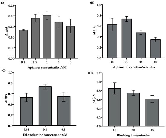 Optimization of (A) aptamer concentration, (B) immobilization time for aptamer, and (C) concentration of blocking solution, and (D) blocking time with 0.1 M ethanolamine.