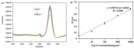(A) SWV response of aptamer/GO/SPCEs aptasensor after incubation with 1 µg mL−1 (purple), 10 µg mL−1 (blue), 100 µg mL−1 (red), 1 × 103 µg mL−1 (orange), and 1 × 104 µg mL−1 (green) of GA; (B) Calibration plot of the aptasensor showing the linear relationship between the logarithm of GA concentration 1–1 × 104 µg mL−1 and corresponding maximum current (∆I) from SWV. Mean current value of each concentration was plotted from three independent experiments.