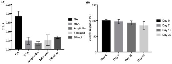 (A) Specificity of electrochemical aptasensor to GA compared with other biomaterials HSA (50 µg mL−1), folic acid (160 µg mL−1), ampicillin (5mg mL−1) and bilirubin (5 mg dL−1). (B) Stability of the aptasensor after a storage at 4 °C for 0, 7, 15 and 30 days for detection of 1 mg mL−1 of GA.