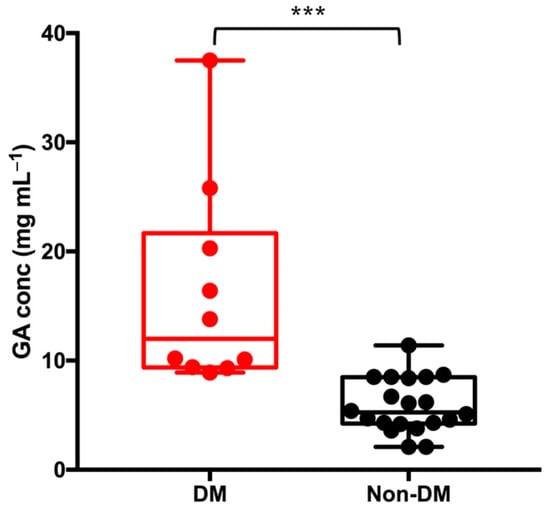 Statistical comparison of GA concentration (mg mL−1) in DM and non-DM groups. The box plot shows statistically significant different GA levels between non-DM and DM groups (*** p < 0.001).