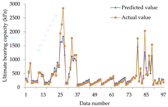 Actual versus predicted ultimate bearing capacity values.