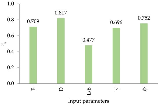 where is the number of data values (this study used 78 data values); and are the input and output parameters. The value ranges from zero to one for each input parameter, and the highest values suggested the most efficient output parameter (which was qu in this study). The values for all input parameters are presented in Figure 4. Figure 4, shows that the depth of foundation, D has the greatest effect on the UBC. The sensitivity results match well with the result of the investigations by Meyerhof [2] and Kohestani et al. [26].