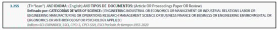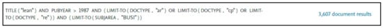 As proposed by Sinha et al. [17] (p. 304), we searched for the keyword “lean” in titles to ensure our focus on both the historical interest and evolution of the topic. A first search on Web of Science conducted on 5 January 2021 provided 13,558 records containing the word “lean” in the title. An initial quick review showed that “lean” is a popular term in other disciplines too. Therefore, our search was refined to some related WoS categories. The final search string is shown in Figure 1.