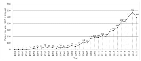 After selection was done, the database records were analyzed based on the bibliometric measure “papers-per-year” (Figure 4).