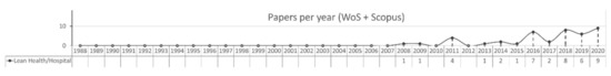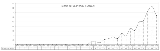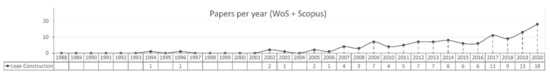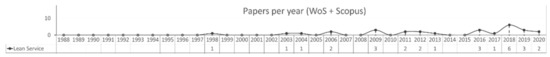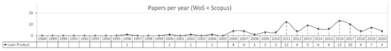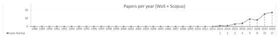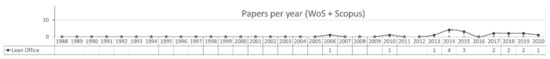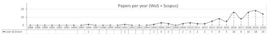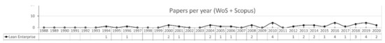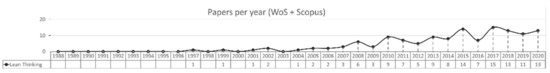Evolution of papers per year that include “lean” in the title over the study period (1988–2020).