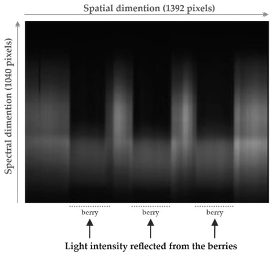 The experimental setup used to acquire the spectral data (line-scan hyperspectral imaging), as well as the procedure to compute the reflectance previously described by the authors in [,,]. Thus, the reader is directed to additional references for a more detailed description. In summary, the system consisted of a hyperspectral camera, composed of a black and white camera and spectrograph, and a lighting source comprising a lamp holder to hold four 20 W, 12 V halogen lamps and two 40 W, 220 V blue reflector lamps. The acquired line-scan hyperspectral images had 1040 × 1392 pixels, in which the 1040 pixels were related to the measured wavelength channels that had a width of approximately 0.6 nm (ranging from 380 to 1028 nm), and the 1392 pixels denoted the spatial dimension (one line over the sample) with a width of approximately 110 nm [,,]. After imaging, a threshold-based segmentation method was applied to identify and extract the grape berries from the complete image. Figure 1 displays an example of a line-scan hyperspectral image acquired by the described setup and for three berries measured simultaneously.