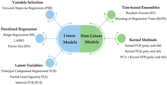 The literature on predictive regression methods is extensive, and to take advantage of the many developments in the field, a careful selection of the potentially effective methods was conducted in this work. The selected methods include linear and non-linear approaches, and cover a wide range of classes of regression methods (see Figure 3). These classes contain different a priori assumptions regarding the distribution of predictors, response variables, and their relationship. Thus, they provide a suitable pool of methods to infer, from the data, which class/method leads to a superior prediction performance. Overall, 16 regression methods were included in this study and compared using L&NL-PAC. This set contains the most popular methods that have found more success in spectroscopic applications, as well as other relevant methods from the general field of regression modeling that have different assumptions regarding the underlying data structure (namely regarding the presence of effect sparsity, collinearity, non-linearity, etc.). Although additional methods could always be considered, the current pool of methodologies provides a comprehensive modeling basis to support the use of hyperspectral imaging for predicting the enological properties of interest. A summary of the regression methods within each class is provided in the following subsections. However, the reader is directed to additional references for a detailed description of the linear- and tree-based ensemble methods adopted [], as well as for the kernel methods [,,].