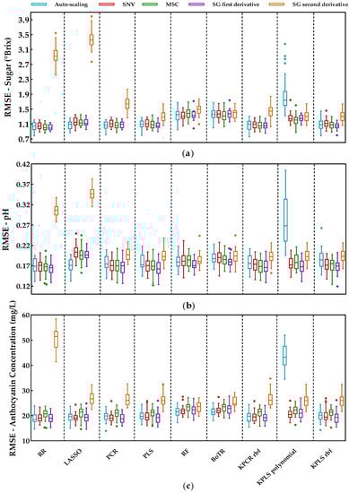 Tukey boxplot showing the RMSE values of the external validation sets obtained by each preprocessing technique over the selected regression methods: (a) results for sugar contents, (b) results for pH, and (c) results for anthocyanin concentration. The bottom and top of the box represent the first and third quartiles (25th and 75th percentiles), and the internal horizontal lines represent the median (50th percentile). The whiskers represent the maximum and minimum data within the 1.5 interquartile range (IQR) and the circles represent outliers outside 3 IQR.