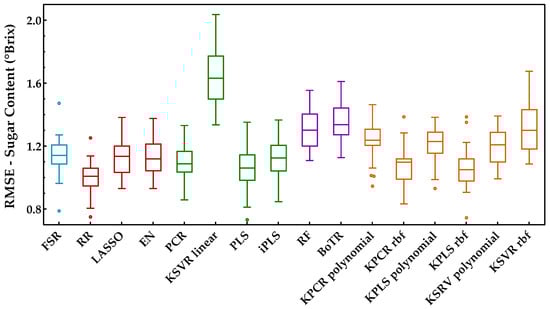 The sugar content is one of the main quality characteristics to evaluate the maturity of grapes and was the first property considered for developing the regression models. The Savitzky−Golay first derivative was applied to the spectra as a preprocessing technique and the RMSEs obtained from the Monte Carlo double cross-validation are presented in Figure 5 for all the regression methods included in this study. This figure clearly demonstrates the need to test a wide range of regression methods from different classes, as the performance of certain methods can be significantly different, even within the same class of methods. Only by testing and comparing their performance can one choose the most suitable regression model for each case. In addition, in order to characterize the overall method’s performance, Figure 6 summarizes the KPI (described in Section 3.3) obtained by each regression method.