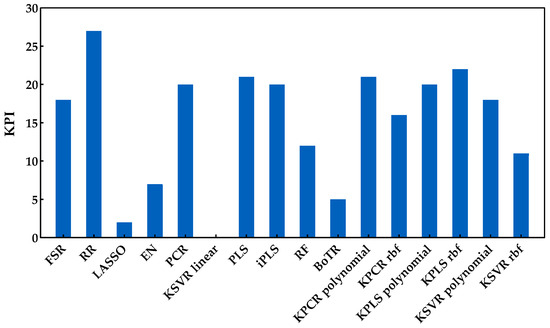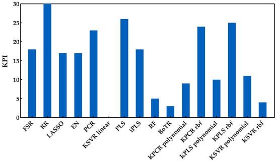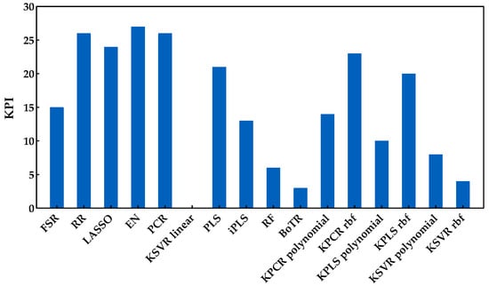 From the analysis of this figure, one can identify the class of penalized regression as the most suitable and promising class to predict the anthocyanins concentration. The same can also be confirmed by Figure 12, wherein this class reached the best scores. Within the latent variable’s class, PCR was the best method, with a similar overall performance to the penalized regression class, namely to RR. However, the other regression methods of the latent variables class presented quite different performances. Such differences can also be observed for the kernel methods class. The class of tree-based ensemble showed the worst overall performance for estimating the anthocyanin concentration. Overall, EN presented the best performance (27 points in 30), losing 2 points for PCR (the difference was statistically significant) and 1 point for the LASSO method (not statistically significant). RR, PCR, and LASSO were the next methods with the best KPI, obtaining values between 24 and 26 (in a maximum of 30 points).