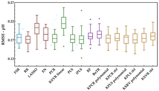 Tukey boxplot showing the pH results for the external validation set obtained for the class of regression methods included: (blue) variable selection, (red) penalized regression, (green) latent variables, (purple) tree-based ensemble, and (orange) kernel methods.