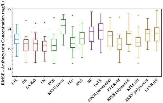 Anthocyanins are the pigments responsible for red wine color and were the last enological parameter considered for the proposed comparison. The procedure adopted was identical to the previous enological parameters, and the results achieved in terms of root mean square error for each class of methods are presented in Figure 11.