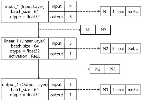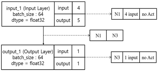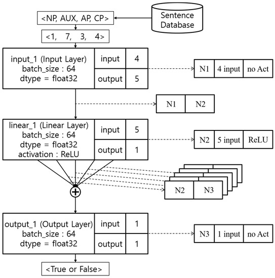 Figure 8 compares generated ANN architecture of the Korean grammaticality task and the English grammaticality task. Figure 8a presents the generated architecture of the Korean grammaticality task. It has one hidden layer with five nodes and four additional links between the hidden layer with ReLU as an activation function and the output layer, instead of leaky ReLU, because of calculation speed. Each layer uses float 32 data type. Figure 8b presents the generated architecture of the English grammaticality task. It has an input layer with four nodes without a hidden layer.
