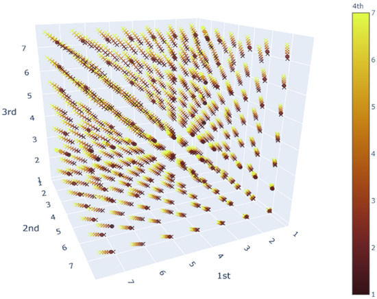 In detail, the verbs in Korean must come at the end of the sentence, whereas English allows the verb to appear with a major degree of placement [28]. The dataset in question consists of 2401 combinations, where 136 sentences are grammatical. The dataset was consulted with two linguists who are native English speakers. In comparison to the Korean dataset, the overlapping cases were 53. The first slot of four words is expressed in the X-axis, and Y and Z, respectively, represent the second and the third slot. The fourth word slot is represented by the color spectrum. The O/X represents grammaticality. Figure 4 shows the distribution of the English grammaticality dataset.