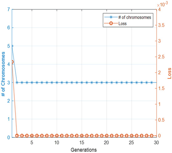 The experiment result is interesting. The resulting architecture for the English dataset is radically different from the one for the Korean dataset, despite their distributional similarity; Korean has 113 grammatical sentences, and English has 136, as shown in Table 3. The evolution process of the experiment is presented in Figure 6; it starts with five chromosomes within three layers, and it evolves into three chromosomes.
