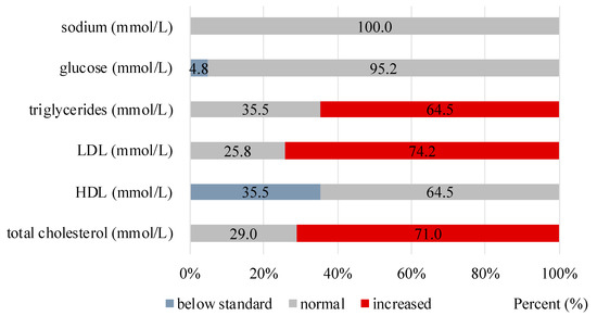 Additionally, the results of blood biochemical tests of 62 patients were analysed. The mean value of total cholesterol in the participants was 5.63 mmol/L (slightly higher in women than in men, 5.80 mmol/L and 5.33 mmol/L, respectively), and in almost half of the participants (45.1%) blood cholesterol levels exceeded the normal level. The levels of LDL cholesterol, triglycerides, and glucose (3.34 mmol/L, 2.02 mmol/L, and 6.99 mmol/L, respectively) were also above normal in a large group of participants. Only the levels of sodium were normal with a minimum value of 135.00 mmol/L. Normal values were also noted for HDL cholesterol in the vast majority of participants, with the mean value of 2.01 mmol/L (see Figure 1).
