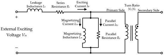 The open circuit of the transformer is shown in Figure 1. The circuit is composed of external excitation voltage Vin, leakage inductance Lk, series resistance Rs, magnetizing inductance Lm, and parallel resistance Rp.
