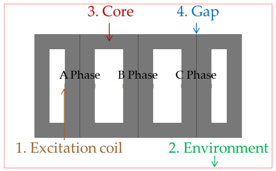 The 2D model of a three-phase five-limb transformer is shown in Figure 2. The model is composed of the exciting coil, the iron core, and the test environment. The model of the iron core has a gap.