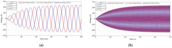 The eddy current effect is not considered in the winding. The simulation results of the winding voltage without a slow start are shown in Figure 5. The simulation results of the winding voltage under conventional equations with an external excitation voltage are shown in Figure 6. The simulation results of the winding voltage under the proposed equations of the external excitation voltage are shown in Figure 7. The peak voltage of each phase is 301.64 V.