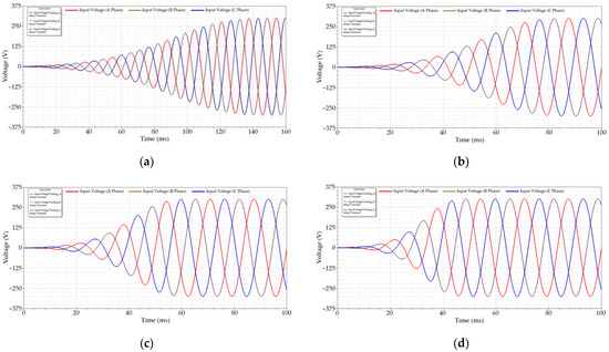 Simulation results of the winding voltage under the proposed equation. (a) ; (b) ; (c) ; (d) .