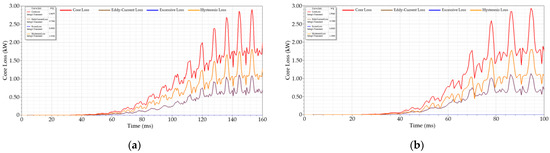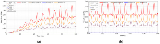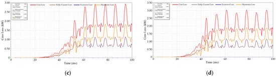 The simulation results of the core loss without a slow start are shown in Figure 11. The simulation results of the core loss under conventional external excitation equations are shown in Figure 12. The simulation results of the core loss under the proposed external excitation equation are shown in Figure 13. The average core losses under different slow start functions are shown in Table 5. The total core loss is composed of two loss components, which are the eddy current loss component and the hysteresis loss component. The average interval time is 200 ms. According to Figure 6, when the and , the time for the external excitation voltage to reach the steady-state is 0.08 s and 0.98 s, respectively. According to Figure 7, when the , , , and , the time for the external excitation voltage to reach steady-state is 0.04 s, 0.06 s, 0.08 s, and 0.14 s, respectively. Therefore, the average interval is 80 ms to 100 ms under , , , and and no slow start condition. The average interval is 0.98 s to 1 s under . The average interval is 0.14 s to 0.16 s under .