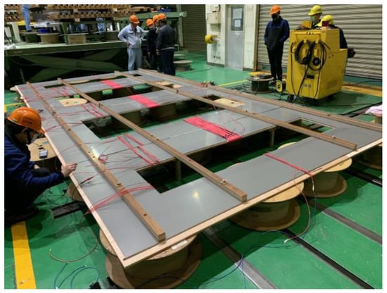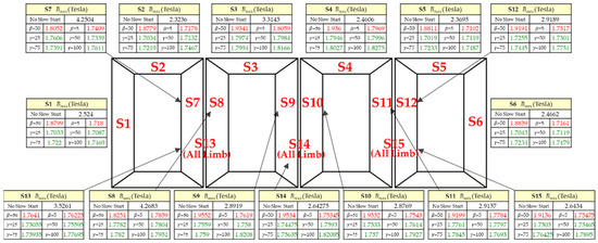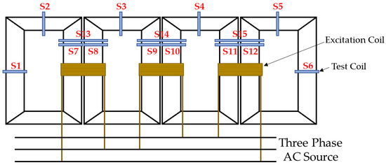 This chapter uses the simulation results from simulation software ANSYS Maxwell and the experimental results to verify the proposed finite element analysis model. First, the adjustable AC power supply is applied to the three-phase five-limb transformer. Secondly, the induced electromotive force is measured by the test coil. Finally, the magnetic flux density of the iron core is calculated according to Faraday’s law. The setting diagram of the three-phase five-limb transformer is shown in Figure 15, in which the test coils S1–S12 are single yokes and single limbs, and the test coils S13–S15 are all limbs. The external voltage is 213.33 V, and the operating frequency is 60 Hz. The turn number of the excitation coil is 46 turns, and the turn number of the test coil is 6 turns. The measured three-phase five-limb is shown in Figure 16.