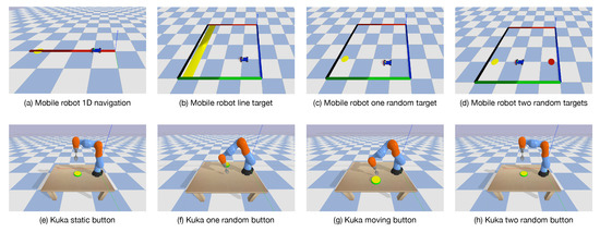 As it shows in Figure 3, in the mobile robot 1D navigation task, the robot moves along a straight line, and the target is a yellow cylinder; In the other three tasks of this environment, the robot moves on a 2D plane. The target in the mobile robot line-target task is a yellow band. The targets in the mobile robot 1-target task and 2-target task are yellow cylinder and yellow/red cylinders, respectively.