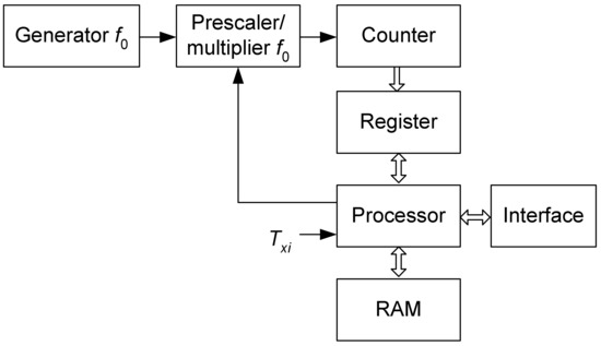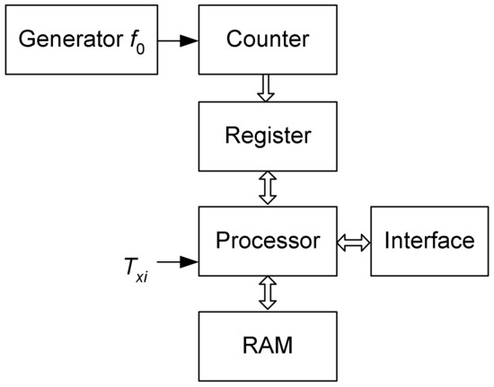 The counter is controlled by a clock generator with the period T0 (Figure 2c). The code output of the counter is connected through a register capturing the state of the counter to the microprocessor. A frequency signal with period Txi is applied to the selected microprocessor input (Figure 2b). The microprocessor reads the counter state at the instants of receiving the start and end impulse Txi (Figure 2d). In this way, in the memory of the microprocessor, information is collected in the form of numbers representing successive values of the periods Txi of the variable frequency signal from the physical-quantity-to-frequency converter.