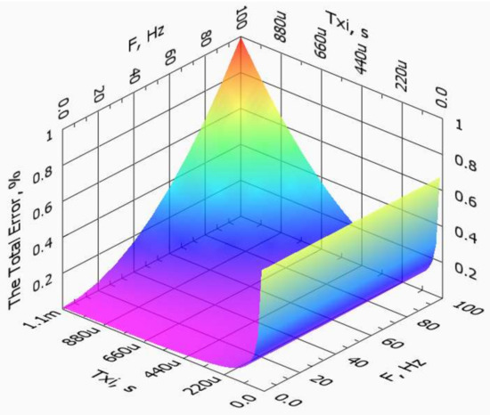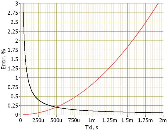 Formula (8) shows that the increase of the Txi period causes the increase of the averaging error, while its decrease causes the increase of the quantization error (Figure 4). An exemplary plot of the total error δ∑ is shown in Figure 5.