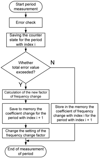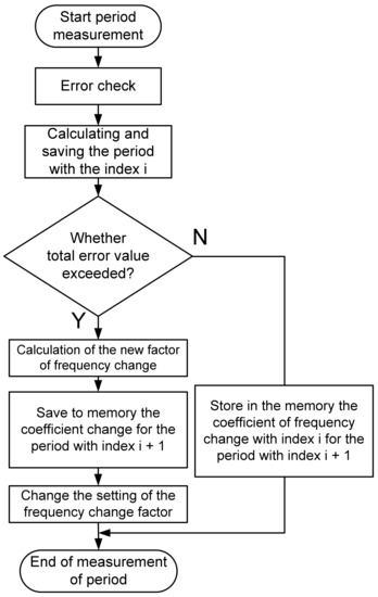 In the case of using a processor with sufficient computational speed compared to the rate of change of frequency of the processed variable frequency signal, it is possible to calculate the period value directly in the frequency-to-code converter. The algorithm for measuring the variable frequency with an f/N converter with a microprocessor system with a satisfactory performance is shown in Figure 9. In this case, the processor also calculates the difference of states read from the counter system, which represents the period value, taking into account the degree of frequency correction in the prescaler/multiplier module and the frequency f0 of the generator model. The computed difference is used to determine the maximum value of the total error made in measuring the period Txi [14], then the computed state difference is used to calculate the actual period value, which is then stored at a given index i in the RAM. Upon detecting that the admissible quantization error value has been exceeded (option “Y”), the procedure calculates a frequency correction factor that allows the processing error (8) to be reduced to the limit set in the program and changes the frequency correction factor in the prescaler/multiplier module. In addition, the value of the frequency shift factor is stored in memory for use in computing the period value with the index i + 1. If the error does not exceed the set value (option “N”), the procedure ends without changing the change factor of frequency, performing only the operation of assigning the i + 1 period to the scaling factor value, such as for the period with the index i. In the case of the alternative algorithm, the master device has the ability to directly read the successive values of the period calculated in seconds.
