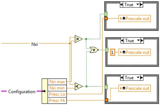 Figure 11 shows the fragment of the diagram that realizes the setting of the Nxi threshold values that trigger the change of the clock signal frequency controlling the operation of the f/N converter counter. The upper Case structure [21] is activated if the current value of Nxi is greater than the value of Nxi max set in the application panel (Figure 12). Then, the frequency change factor Prec Lo is set (Figure 11 and Figure 12). The middle Case structure handles the case where the current numerical value of Nxi is between the set values of Nxi min and Nxi max. Lastly, the lower Case structure handles the signal if the current Nxi is less than the given value of Nxi min. Then, the change factor Presc Hi is set.