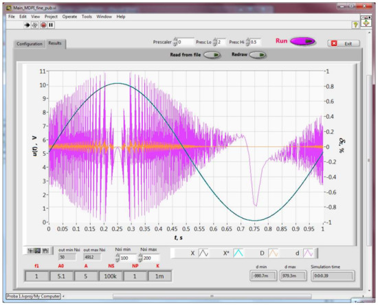 Figure 10 shows the fragment of the application diagram with the presentation of the subroutines that perform the following sequence: creation of the Txi period table, f/N processing, reconstruction of the x(t) waveform, and creation of a unique name of data files containing information about the test signal parameters and simulator application configuration.