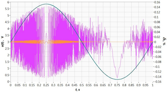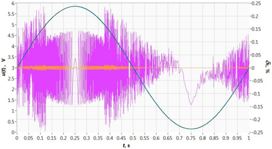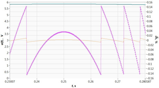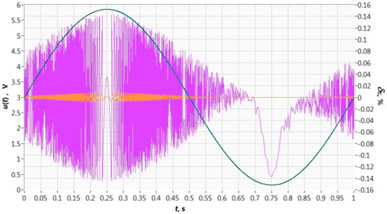 Figure 14 shows the results of the simulation of the test signal processing by an f/N converter using the basic processing method. The effect was in line with the expectations. In the range of the high values of the instantaneous voltage, a very large influence of the quantization error δk can be seen. In terms of the smallest instantaneous values of the test signal, a significant influence of the averaging error δa is evident. The values of Nxi represent the test signal ranged from 171 to 6656. The relative error of the information processing was within the range of −0.29% to 0.23%.