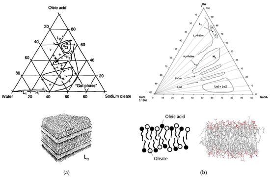 McBain and Stewart published a ternary phase diagram of the oleic acid/potassium oleate/water system for T = 25 °C already in 1933 [54], and Small reported one for the oleic acid/sodium oleate/water system for T = 37 °C in 1968 [55]. A more recent and also more detailed triangular diagram for the oleic acid/sodium oleate/water system is the one published by Engblom et al. (1995) for T = 20 °C [56] (Figure 4a). Along the water sodium oleate base line of the triangle (representing samples without oleic acid), the situation for sodium oleate/water mixtures at T = 20 °C is shown. According to Figure 3a the L1 and H1 phases should not be present at T = 20 °C, but both phases seem to exist in the presence of small amounts of oleic acid (Figure 4a). At increasing content of oleic acid, other phases form as well, notably a lamellar phase (Lα, which exists in the samples as large multilamellar vesicles), an inverted hexagonal phase (H2), and a cubic phase of unknown structure (Q). Close to the oleic acid corner, an isotropic solution of inverted micelles forms (L2). The center of the lamellar phase region (Lα), as an example, corresponds to a composition of 40 wt% sodium oleate, 20 wt% oleic acid, and 40 wt% water (Figure 4a). Areas within the triangle that are not specified or labeled either represent compositions where phase separation occurred (for example, two phases of different composition, macroscopically separated from each other, appearing as denser lower phase and as lighter upper phase) or were not investigated at all.