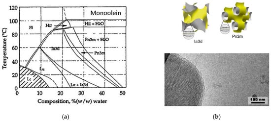 Monoolein (=1-(cis-9-octadecenoyl)-rac-glycerol = glycerol monooleate) belongs to Class II of the polar lipids (Table 1). Although it has hemolytic properties, monoolein is a biodegradable and biocompatible amphiphile that generally is recognized as safe and useful for many applications, for example, in formulations for the delivery of drugs [71,72,73,74]. Monoolein/water systems were investigated intensively in the past [72,75,76,77]. Applications emerged from fundamental studies on the aggregation behavior of monoolein in water. The binary phase diagram published by Briggs et al. (1996) [76] is reproduced in Figure 6a. It shows the phase situations with increasing water content up to 50 wt% for temperatures between T = 20 and 110 °C. In an extended version of this diagram published by Qiu and Caffrey (2000) [77], the temperature range was extended down to T = −15 °C. As seen in Figure 6a, the melting temperature of pure monoolein (no H2O) is 36 °C, the temperature at which the lamellar crystalline phase (Lc) melts into a fluid isotropic phase (FI). The phases that are present at T = 25 °C with increasing water content are the following: between ~7 and ~19 wt% water, a lamellar liquid crystalline phase exists (Lα); between ~19 and ~22 wt%, Lα coexists with the inverse bicontinuous cubic phase Ia3d [58,78]; between ~22 and ~38 wt%, Ia3d is present; between ~38 and ~39 wt%, Ia3d coexists with the inverse bicontinuous cubic phase Pn3m (see [58,77,78]); between ~39 and ~42 wt%, Pn3m is present; and above ~42 wt% (up to more than 95 wt% water), Pn3m coexists with water (Pn3m + H2O). In this large water-rich area of the phase diagram, the cubic phase Pn3m can be dispersed in water by strong mechanical agitation or sonication, for example, to form kinetically stable cubosomes, i.e., dispersed cubic phase as small particles. Usually, without stabilizers, these cubosome particles are not very stable (see Chapter 3). A cryo-TEM image of a sample consisting of 98 wt% water and 2 wt% monoolein, quenched from room temperature, is shown in Figure 6b [79]. In this bicontinuous cubic phase, the amphiphiles are arranged in bilayers with balanced convex and concave curvatures, which results in an energetically minimal structure (the mean curvature at any point on the surface is zero) [80]. On average, the packing parameter of monoolein in Pn3m is p = 1.