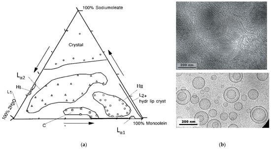 Aqueous mixtures of monoolein, sodium oleate, and water were investigated systematically. The triangular phase diagram published by Borné et al. (2001) for T = 25 °C is shown in Figure 7a [81]. A similar diagram was also determined for T = 37 °C [81]. One characteristic feature of both diagrams is the large region where a lamellar phase (Lα) is present. A cryo-TEM image of this lamellar phase is shown in Figure 7b (top) for 10 wt% monoolein, 5 wt% sodium oleate, and 85 wt% water [81]. The lamellar phase appears as multilamellar vesicles. To distinguish this lamellar phase from the lamellar phase obtained for the monoolein/water system (no oleate, Lα in Figure 6a, abbreviated as Lα1), the monoolein/oleate/water lamellar phase is abbreviated as Lα2 [81]. Unilamellar vesicles representing dispersed Lα2 phase were found to be present in multiphase regions of the phase diagram shown in Figure 7a localized close to the water corner (>90 wt% water), in proximity to the region where the lamellar phase, Lα2, was identified; see the cryo-TEM image of Figure 7b (bottom) [79].