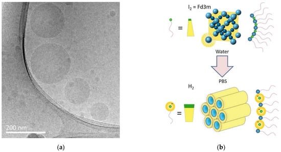 The situation becomes complicated if aqueous mixtures of monoolein, oleic acid, and oleate are investigated. The ratio of oleic acid to oleate can be set by adjusting the pH value, often involving the use of buffer salts. The buffer salts themselves may also have an effect on the aggregation state and on the kinetic stability of dispersed phases. Moreover, it was demonstrated by Fong et al. (2020) [82] that with small amounts of the amphiphilic nonionic block copolymer Pluronic F127 (=Poloxamer 407) [83] dispersed micellar cubic phase Fd3m (cubosomes) can be stabilized (Figure 8a). In this latter work, it was also shown that by increasing the amount of oleate in the system (by increasing the pH value using phosphate-buffered saline, PBS), the inverse micellar cubosome dispersion obtained at pH = 4.3 (at low ionic strength) transforms into hexosomes, i.e., dispersed inverse hexagonal phase H2 at pH ~ 7.4 and T = 30 °C [82]. Figure 8b depicts this phase transformation as a consequence of a change of pH value and salt content, which resulted in a change of the molecular packing [82].