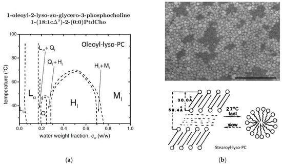 The lysolecithin oleoyl-lyso-PC (=1-oleoyl-sn-glycero-3-phosphocholine = 1-oleoyl-2-hydroxy-sn-glycero-3-phosphocholine) belongs to Class IIIA of the polar lipids, like sodium or potassium oleate (Table 1). Oleoyl-lyso-PC is a “micelle-forming amphiphile” (p ~ 1/3). Therefore, like in the case of the sodium oleate/water system (Figure 3a), the binary oleoyl-lyso-PC/water phase diagram has an extended isotropic region consisting of (normal) micelles. They self-assemble at T = 25 °C in water-rich mixtures, above about 75 wt% water, above the CMC; see Figure 9a. The diagram in Figure 9a was published by Marsh (2013) [84] on the basis of the one elaborated by Arvidson et al. (1985) [85]. In the diagram shown in Figure 9a, the region of the micellar solution (usually denoted as L1) is abbreviated as MI. The presence of a normal hexagonal phase (consisting of packed cylindrical micelles, HI) between 30 and 70 wt% water is a characteristic feature of this diagram, while a lamellar phase (Lα) and a cubic phase (QI) exist at low water content.