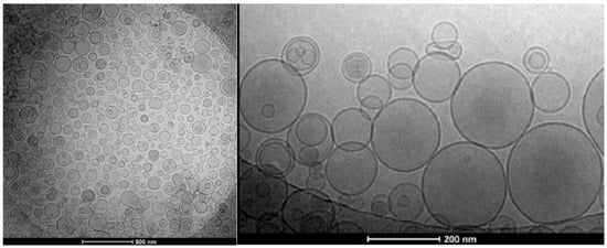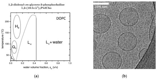 DOPC belongs to Class II of the polar lipids (Table 1). It is a typical “bilayer-forming amphiphile” (p ≈ 1) [88,89]. This is evident from the binary phase diagram determined by Bergenståhl and Stenius (1987) [90], redrawn in a compilation of phase diagrams by Marsh (2013) [84]; see Figure 10a. Apart from an inverse cubic phase (QII) at low water content between T = 60 and 120 °C and an inverse hexagonal phase (HII) at even higher temperature, a lamellar phase (Lα) exists between ~10 wt% water (at T = 25 °C) and ~42 wt% water. Above ~42 wt% water, this lamellar phase is in equilibrium with water, forming a two-phase system (Lα + water). Dispersing the lamellar phase (multilamellar vesicles, MLVs, in reality) in excess water results in the formation of dispersed vesicles, i.e., self-closed bilayers, often with diameters above 500 nm. These vesicles are only kinetically stable and will turn back to two phases after prolonged storage. Depending on how the lamellar phase is dispersed (see Chapter 4), the vesicles might be mainly unilamellar (see as an example the cryo-TEM image in Figure 10b [91]), and the vesicle dispersion may be colloidally stable for a long time without aggregation and eventually fusion into multilamellar vesicles and without macroscopic phase separation.