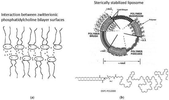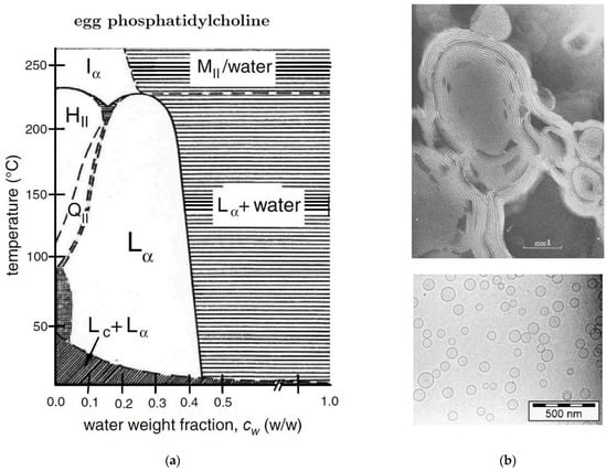 Egg PC is a mixture of phosphatidylcholines isolated from chicken egg yolk. All molecules have the same polar head group (zwitterionic sn-glycero-3-phosphocholine). Variations among the molecules exist in the type of fatty acid chains esterified to the two hydroxyl groups at positions sn-1 and sn-2 of glycerol; see Table 2. In Table 2, data for soybean PC (a mixture of extracted phosphatidylcholines from soybean) are also included. In the case of egg PC, the majority of the fatty acyl chains are palmitoyl (C16:0) and oleoyl (C18:1) chains, while in the case of soybean PC, linoleoyl (C18:2) chains clearly dominate [92,93]. The binary eggPC/water phase diagram originally published by Small (1967) [94] and redrawn by Marsh (2013) [84] is shown in Figure 11a. In Figure 11b (top), the famous electron micrograph of a multilamellar dispersion of egg PC in water is shown, as published by Bangham and Horne (1964) [95], together with a cryo-TEM image of a dispersion of egg PC vesicles prepared by the detergent dialysis method (bottom) [96]. The pioneering work of Bangham is the beginning of the research on liposomes (lipid vesicles), originally also called “Banghasomes” [16,17].