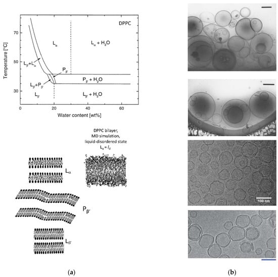 Aqueous dispersions of DPPC. (a) Top: Binary DPPC/water phase diagram, as published by Koynova and Caffrey (1998) [101]. Bottom: Schematic drawings of the fluid, liquid-disordered lamellar phase (Lα) [84], and a snapshot from a molecular dynamics simulation of a DPPC bilayer in the Lα state [106], of the the solid-ordered ripple phase (Pβ′) [107,108], and of the solid-ordered lamellar phase (Lβ′) [84]. (b) Cryo-TEM images of aqueous DPPC vesicle dispersions. From top to bottom: First and second: dispersion of DPPC in 50 mM Mes buffer (pH = 6.0, 150 mM NaCl, 5 mM EDTA), as obtained by repeated freezing in liquid nitrogen and thawing at T > Tm ~ 41 °C (bar: 200 nm), either quenched from T = 50 °C (first) or T = 25 °C (second); see El Jastimi et al. (1999) [109]. Third: dispersion of DPPC in 10 mM Tris-HCl buffer (pH = 7.4), as obtained by repeated extrusion through 100 nm polycarbonate membranes at T = 60 °C (bar: 100 nm), and quenched from T = 25 °C; see Farkuh et al. (2019) [110]. Fourth: dispersion of DPPC in D2O, as obtained by repeated extrusion through 100 nm polycarbonate membranes (bar: 100 nm), and quenched from T = 25 °C, see Matviykiv et al. (2019) [111]. Reproduced from [84], copyright © Taylor and Francis, 2013; and with permission from [101], Elsevier, 1998; from [106], AIP Publishing, 1996; from [107], Springer Nature, 2000; from [109], Elsevier, 1999; from [110], Elsevier, 2019; and from [111], American Chemical Society, 2019.