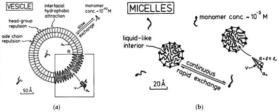 The situation in the case of oleic acid + oleate mixtures is very similar to the case of vesicles formed from phospholipids like DOPC or POPC; see later Section 2.10 and Section 2.11. All these vesicle dispersions are obtained by guided assembly procedures and usually are only kinetically stable dispersions, i.e., they do not represent thermodynamic phases. These vesicle dispersions can, however, be colloidally stable for several days or weeks. The cryo-TEM images in Figure 5 demonstrate the existence of mainly unilamellar vesicles in aqueous oleic acid/sodium oleate dispersions, as obtained through guided assembly procedures at concentrations above the critical vesiculation concentration (CVC) [51,63,65,68,69]. The CVC is also known as “critical concentration for bilayer formation”, CBC [70]. For oleic acid/oleate systems at pH = 8.5–9.9, CVC ~ 0.4-0.7 mM [63].