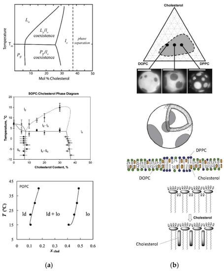 The binary DPPC/water phase diagram is very similar to the DOPC/water or egg PC/water phase diagrams. However, the main phase transition temperature of DPPC at high water content is Tm (DPPC) = 41.3 ± 1.8 °C [101], which is considerably higher than Tm (DOPC) or Tm (egg PC); see Section 2.11. The consequence is that the fluid (liquid crystalline) lamellar phase (Lα) exists at elevated temperature only, above Tm ~ 41 °C and above about 20 wt% H2O; see Figure 12a (top). This lamellar fluid (“liquid-crystalline”) state of the amphiphilic lipids is also called “liquid disordered state” (ld) [105,106].